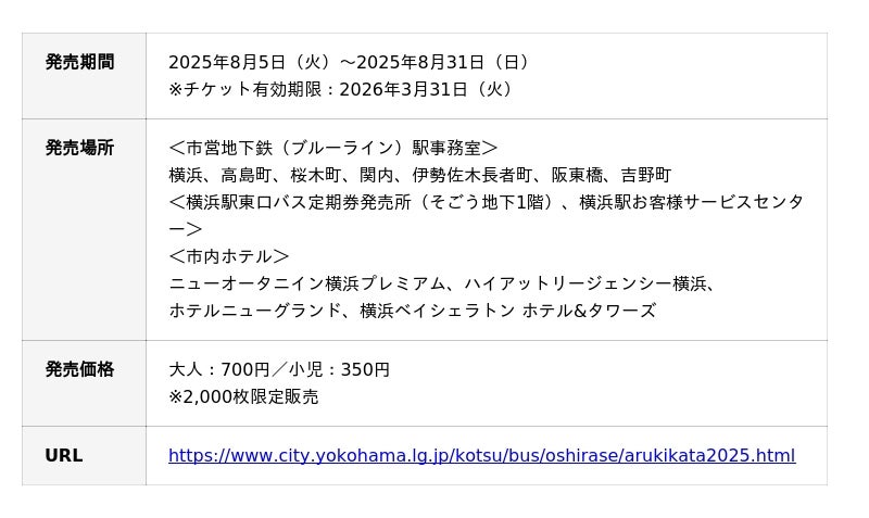 ベイエリア周辺の横浜市営地下鉄、連節バス「ベイサイドブルー」、観光スポット周遊バス「あかいくつ」を含む横浜市営バス・神奈中バスが利用でき、チケット提示で提携店舗から割引・プレゼント等の特典を受けられる、便利でお得な横浜観光1日乗車券です。