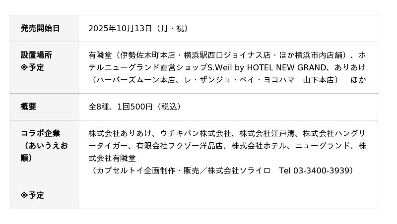 『地球の歩き方 横浜市』発売1周年を記念し、横浜市内で長年愛されてきたグルメやグッズ等の企業とコラボした『地球の歩き方 横浜市』ミニチャーム付きカプセルトイ「ハマッコレクション」を販売します。併せて、『地球の歩き方 横浜市』発売1周年を記念したイベントを開催する予定です。詳細はHP等で別途お知らせします。
