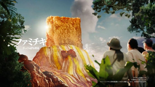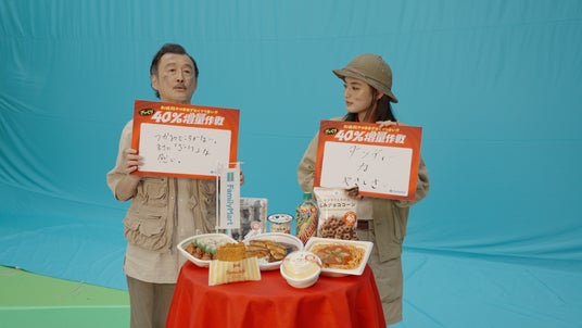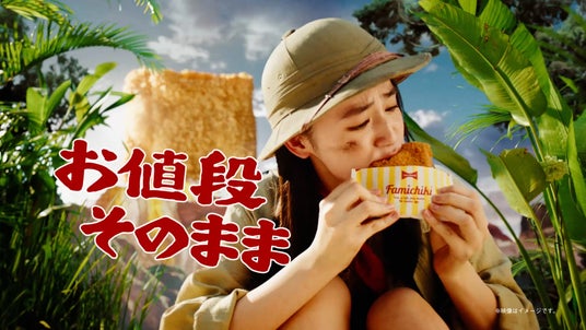 新TVCMでは、吉田さんと八木さんが探検隊に扮し、ジャングルを進む冒険の旅へ出発。ジャングルを探検していると、八木さんが「あれは!」と何かを発見。現れたのは、想像をはるかに超えるサイズのファミチキ。吉田さんも「でかいファミチキ…」と、思わず驚きの声を漏らします。さらに、吉田さんが「うわっ!」と何かにつまずくと、崖の下には巨大化したロースかつカレーが。ラストでは、探検隊の仲間たちとともにざっくり40%増量した商品を味わい、「うまかった~!」と、驚きのボリュームと美味しさへの満足感を表情豊かに伝えています。