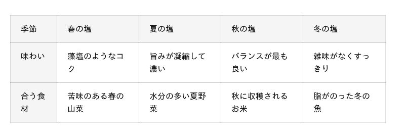四季の塩は、海水を汲み上げる季節ごとに味と含まれるミネラルが異なります。気候や食材が四季で変わるように、四季折々の森と海のミネラルを豊富に含む海水からつくられる塩は、自然に含まれるミネラルの違いによって、四季それぞれの味わいが生まれます。その季節の塩は、旬の食材の味わいをぐっと引き立てますので、是非あわせてお愉しみください。