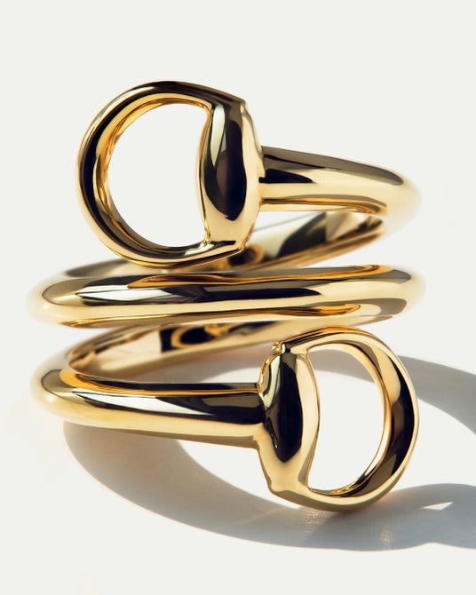 18Kイエローゴールドのジュエリーには、2種類のネックレス、2種類のブレスレット、3種類のリング、そして1種類のピアスがあり、大胆でモダンなスタイルが印象的です。ネックレスは、同一サイズまたは異なるサイズのホースビットモチーフを連ねたデザインです。ブレスレット、リング、ピアスも同じデザイン コンセプトで、ホースビットがチェーンのようになめらかに連なりながら、洗練された輝きを放ちます。さらに両端にホースビット モチーフをあしらったコントラリエリング(オープンタイプのリング)やシンプルでありながらホースビットが存在感を放つリング、革新的ともいえるフレキシブルな開閉が可能な2種類のカフブレスレットも登場します。