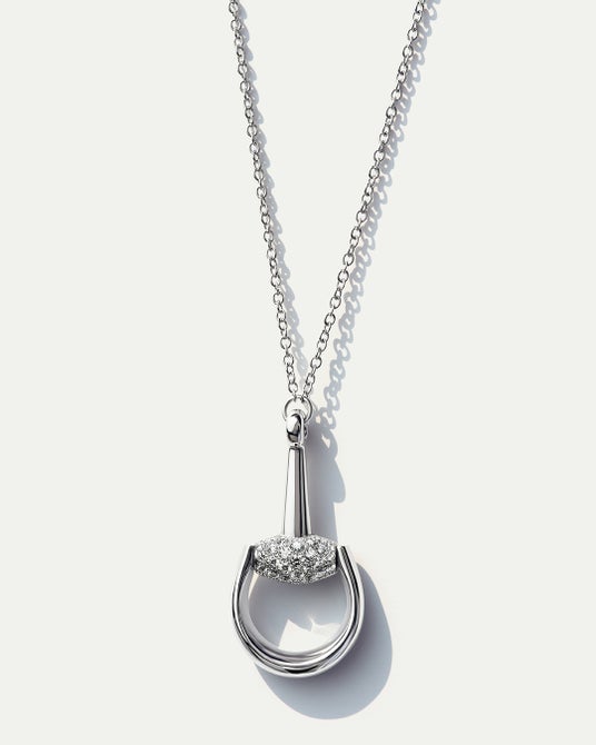 18Kホワイトゴールドのジュエリーは、ダイヤモンドのプレシャスなきらめきが気品あふれる美しさを際立たせます。ネックレスは、ホースビット ペンダントのサイズ違いで2種類あり、それぞれのペンダントの一部にパヴェ ダイヤモンドが施されています。ブレスレットは、ホースビット チャームにダブルのチェーンを組み合わせたしなやかなチェーンタイプと、ひとつのホースビット モチーフをシンボリックにデザインした2種類のカフタイプがあります。イヤリングは、洗練されたフープタイプ、ダブルホースビットのペンダントが揺れるピアス、開閉式で着け外しやすいモダンなイヤーカフがあり、すべてにダイヤモンドがあしらわれています。さらにホースビット モチーフをパヴェ ダイヤモンドがエレガントなきらめきで飾るリングも登場します。