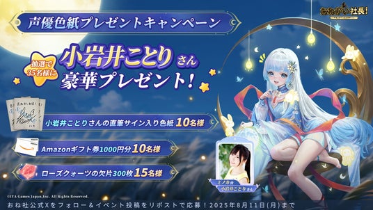 抽選賞品:小岩井ことりさん直筆サイン入り色紙×10名様、Amazonギフト券1000円分×10名様、ゲーム内アイテム「ローズクォーツの欠片300枚」×15名様
