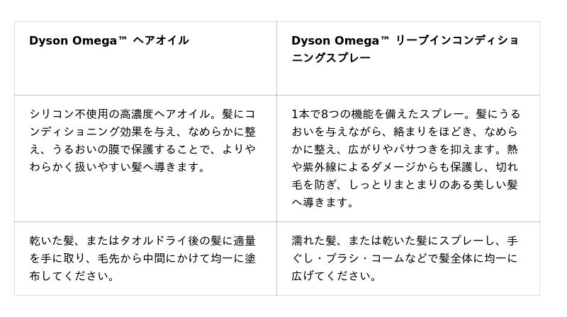 その成果が、ダイソンファームで栽培した原材料を初めて配合した「Dyson Omega(TM) シリーズ」です。すべての髪質に対し、乾燥や絡まり、うねりといった悩みに自然由来成分でアプローチします。今後も、革新的な技術と成分科学を融合させ、髪の健康をさらに進化させていきます。"