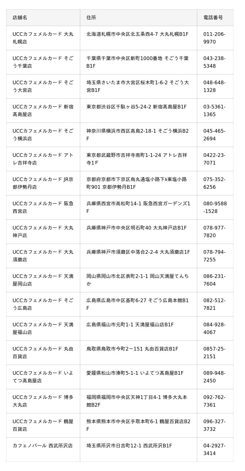 ○取り扱い店舗一覧(コーヒー豆挽き売り業態「UCCカフェメルカード」17店舗、「カフェノバール」1店舗 計18店舗)