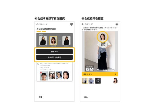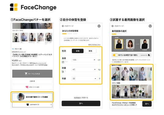 FaceChangeは、ECサイト上のモデルやスタッフのコーディネート画像とユーザーの顔写真を合成し、自分の顔を合わせた着用イメージを可視化できるサービスです。(特許申請中)