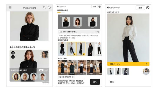株式会社メイキップ(東京都新宿区、代表取締役:柄本 真吾、以下「メイキップ」)は、顔合成AI「FaceChange(フェイスチェンジ)」(特許出願中)において、ECサイトに掲載されているスタッフのコーディネート画像に自分の顔を合成できる新機能をリリースしました。また、ユーザーが身長・体重・年齢・性別といった身体データを登録すると、自分の体型に近いスタッフのコーディネート画像が優先的に表示されます。その画像に自分の顔を合成することで、「本当に自分に似合うかどうか」をよりリアルなイメージで確認できるようになりました。