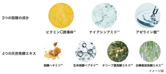 *1 サッカロミセス/コメ発酵液 *2アスコルビルグルコシド(整肌成分)*3整肌成分 *4グルコノバクター/ハチミツ発酵液(保湿成分)*5アスペルギルス培養物(保湿成分)*6ガラクトミセス/オリーブ葉発酵エキス(保湿成分)*7ガラクトミセス/シラカンバ樹液発酵液(保湿成分)*8ヒアルロン酸Na(保湿成分) *9プセウドジマエピコラ/アルガニアスピノサ核油発酵液(保湿成分) *10サッカロミセス/(パイナップル果汁/コラーゲン)発酵液(保湿成分) ※シリーズ比