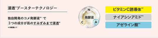 ・ビタミンC誘導体*²、ナイアシンアミド*³、アゼライン酸*³、発酵アルガンオイル*⁹を高濃度