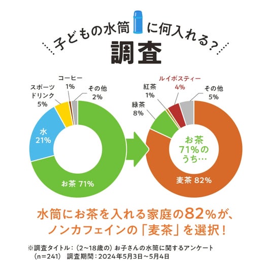 保育園や小学校に水筒を持って通うことが当たり前になった昨今、毎朝のお子さまの水筒づくりは地味に大変です。濃縮(希釈)タイプであれば、ホットでも、アイスでも、季節に合わせて素早く水筒の準備をすることができます。また、ルイボスティーは麦茶同様ノンカフェインであるため、お子さまにも安心して飲んでいただくことができます。●お子さまの水筒にどんな飲み物を入れていますか?
