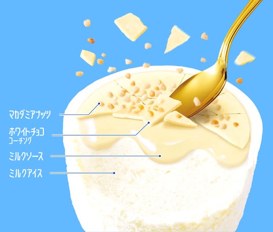 微細氷を使ったアイスの「シャリッ」とした食感、ホワイトチョココーチングの「パリッ」とした食感、そしてミルクソースの「とろり」とした舌触りに加えアクセントとなるマカダミアナッツをトッピングしました。お好みで組み合わせて食べ進めると、最初から最後まで多様な味わいの変化を楽しめます。