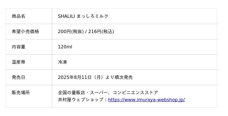井村屋株式会社(本社:三重県津市高茶屋七丁目1番1号、社長:岩本 康)は、アイスの新商品として『SHALILI まっしろミルク』を、2025年8月11日(月)より全国にて期間限定で発売します。