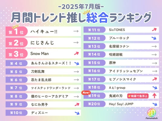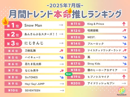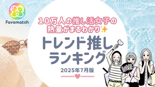 推し活アプリFavomatch(ファボマッチ)を運営する株式会社Favosia(本社:東京都港区、代表:浅埜菜美子)は、2025年7月にアプリ内で最も人気を集めたコンテンツやキャラクターをもとに、「月間トレンド推しランキング(総合/本命/推しメン)」を発表しました。