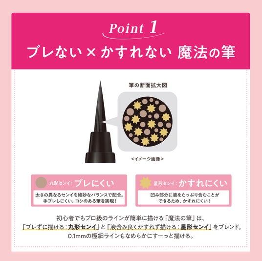 Point 1:誰でもプロ級!ブレない × かすれない「魔法の筆」「ブレずに描ける」丸形センイと、「かすれず描ける」星形センイをブレンドし、0.1mmの極細ラインもなめらかに描けます。