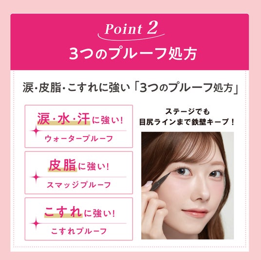 Point 2:涙・皮脂・こすれに強い!3つのプルーフ処方1.涙・水・汗に強い:ウォータープルーフ
