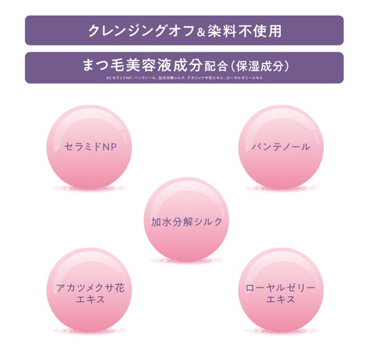 肌へのやさしさを考えた処方染料不使用でクレンジングしやすい処方。また、まつ毛美容液成分※2も配合されており、まつ毛のケアも同時に叶えます。
