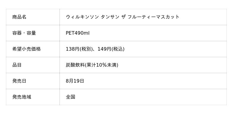 アサヒ飲料株式会社(本社 東京、社長 米女太一)は、『ウィルキンソン タンサン ザ フルーティーマスカット』を8月19日から発売します。