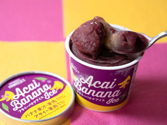 また、「アサイー×バナナ」の味わいの魅力を最大限表現するため、製法にもこだわりました。アサイーピューレとバナナピューレを混ぜ合わせてベースとなる「アサイーバナナアイス」を作り、アイスをカップに充填する際、さらにバナナソースも同時に注入。バナナソースをアイスと同時に充填することで、どこを食べてもアサイーの酸味とバナナのまろやかな味わいが調和する、濃厚でなめらかな口当たりのアイスに仕立てています。
