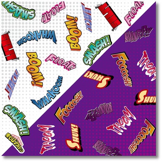 ヒーローや敵<ヴィラン>のオノマトペが入った、おせち限定デザイン。ツートーンカラーなので包み方次第でアレンジも楽しめます。
