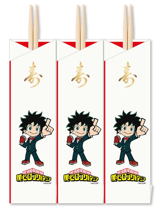 緑谷出久のスーツ姿がデフォルメされたデザインの箸袋付き祝箸が3膳付属。
