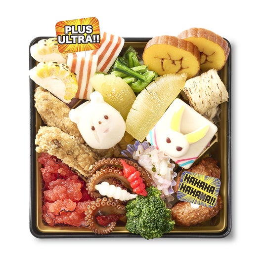 完売御礼となった昨年発売の"ヒロアカおせち2025"。「ヒロアカ」ファンのみならず、大人から子どもまで幅広い世代にご好評いただきました。2026年版はおせちのモチーフとなるキャラクターや食材をアップデート。和洋中の料理を三段重にバランスよく盛り付け、見て楽しい、食べておいしいおせちをお届けします。また、小さなお子様も食べやすいメニューを中心としたお重は、プレゼントとしても喜ばれるおせちです。