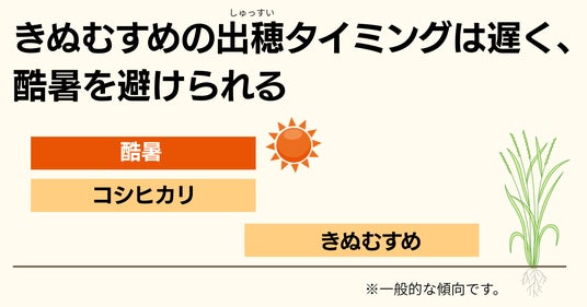 田中農場では、コシヒカリと同等の美味しさを持ちつつ、猛暑でも品質を保てる品種として、きぬむすめを採用しました。きぬむすめは、コシヒカリと比べて穂が出るタイミングがお盆明けと遅めで、最も暑い時期を避けることができるので、猛暑の影響を受けにくい特性を持ちます。