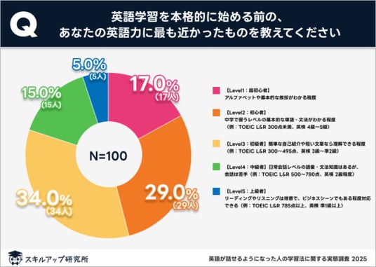 本調査において、英語学習成功者の学習開始時の英語力を尋ねたところ、「Level1:超初心者」(17.0%)、「Level2:初心者」(29.0%)、「Level3:初級者」(34.0%)を合わせると、全体の80%に達することが明らかになった。