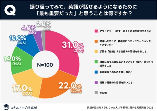 学習成功者に「最も重要だったこと」を尋ねたところ、「アウトプット(話す・書く)の量を確保すること」(31.0%)が最多となった。