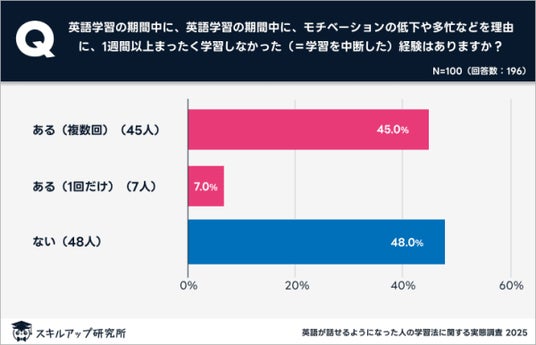 意外なことに、学習成功者のうち52%が「1週間以上学習を中断した(=挫折した)経験がある」と回答した。スランプは特別なことではなく、誰もが通る道であると言える。