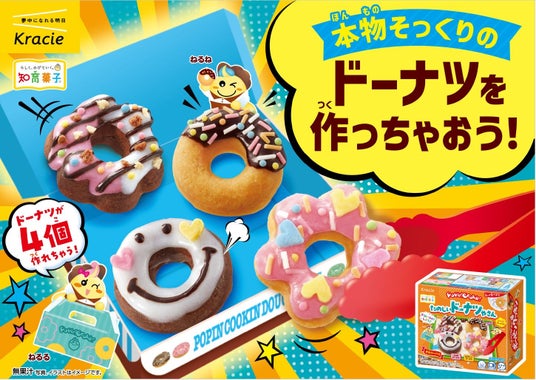 「ポッピンクッキン たのしいドーナツやさん」は、"ドーナツ"をモチーフにした、見た目も味も本物そっくりでふわふわ食感が楽しめる手作り菓子です。第5次ドーナツブームの盛り上がりを受け、「手作りお菓子に初めて挑戦するお子さま」でも失敗しにくく、楽しく作れる商品設計を目指してリニューアルし、3年ぶりに復活いたします。