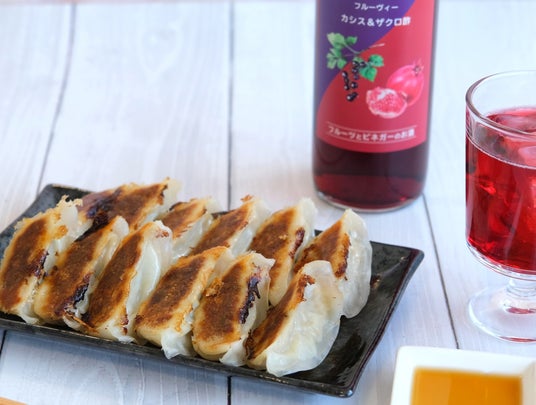 ペアリング1.餃子餃子のジューシーな旨味、焦げの香ばしさに、Fru:Vie(フルーヴィー) カシス&ザクロ酢の果実由来の酸味とザクロ酢の酸味が相性抜群です。