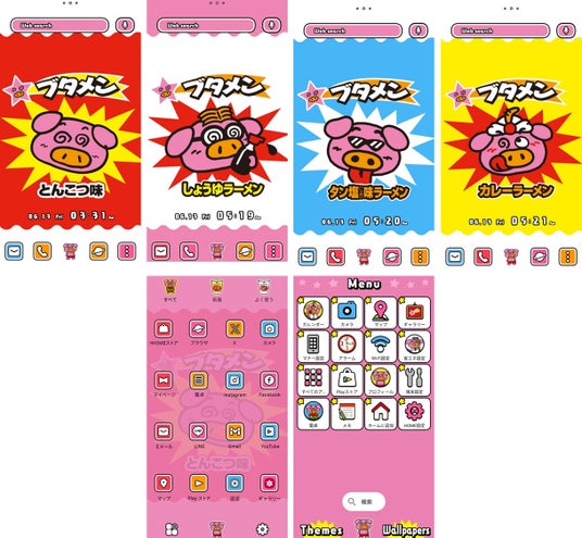 ピンクの画面が可愛らしい「ブタメン」デザインも!キブンに合わせて味を選べる「ブタメン」のように、ホーム画面も4種類。