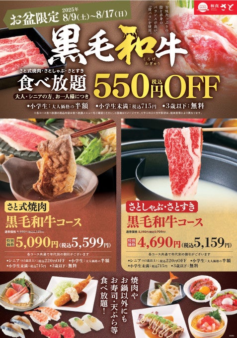 国内199店舗を展開する「和食さと」では、2025年8月9日(土)~8月17日(日)の9日間、お盆期間限定の「黒毛和牛コース特別価格キャンペーン」を開催いたします。本キャンペーンでは、「黒毛和牛食べ放題コース」を大人・シニアの方お一人様につき税込550円引きでご提供いたします。さと式焼肉黒毛和牛コースは、(通常価格) 6,149円のところ(特別価格)5,599円で販売、さとしゃぶ・さとすき黒毛和牛コースは、(通常価格) 5,709円のところ(特別価格)5,159円で販売します!! 柔らかくジューシーな黒毛和牛をお得な価格で存分にご堪能いただけます。このお盆期間は、ご家族との団らんの場として、そして特別な思い出づくりの場所として、和食さとをぜひご利用ください。