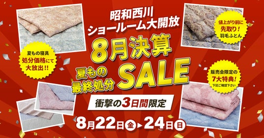 8月22日(金)~24日(日)の3日間、昭和西川の大阪ショールームにて「8月決算SALE」を開催します。まだまだ続く熱帯夜に嬉しい夏もの寝具も、決算のため処分価格にて大放出!また、注目「30年MuAtsu(ムアツ)」をはじめ、ネット限定モデルや秋冬の先行展示品まで、全商品を実際にお試しいただけます。