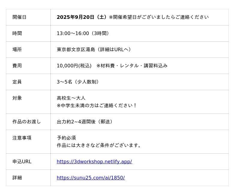 生成 AI でデザイン → AI 3Dモデレーターで立体化。初めてでも安心して参加できる少人数ワークショップ です。
