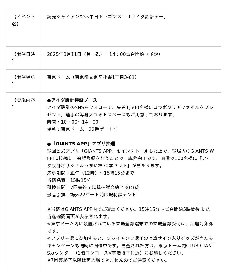 アイダ設計は、読売ジャイアンツのオフィシャルスポンサーとして、今年も東京ドームでの「アイダ設計デー」を記念した特別キャンペーンを実施します。