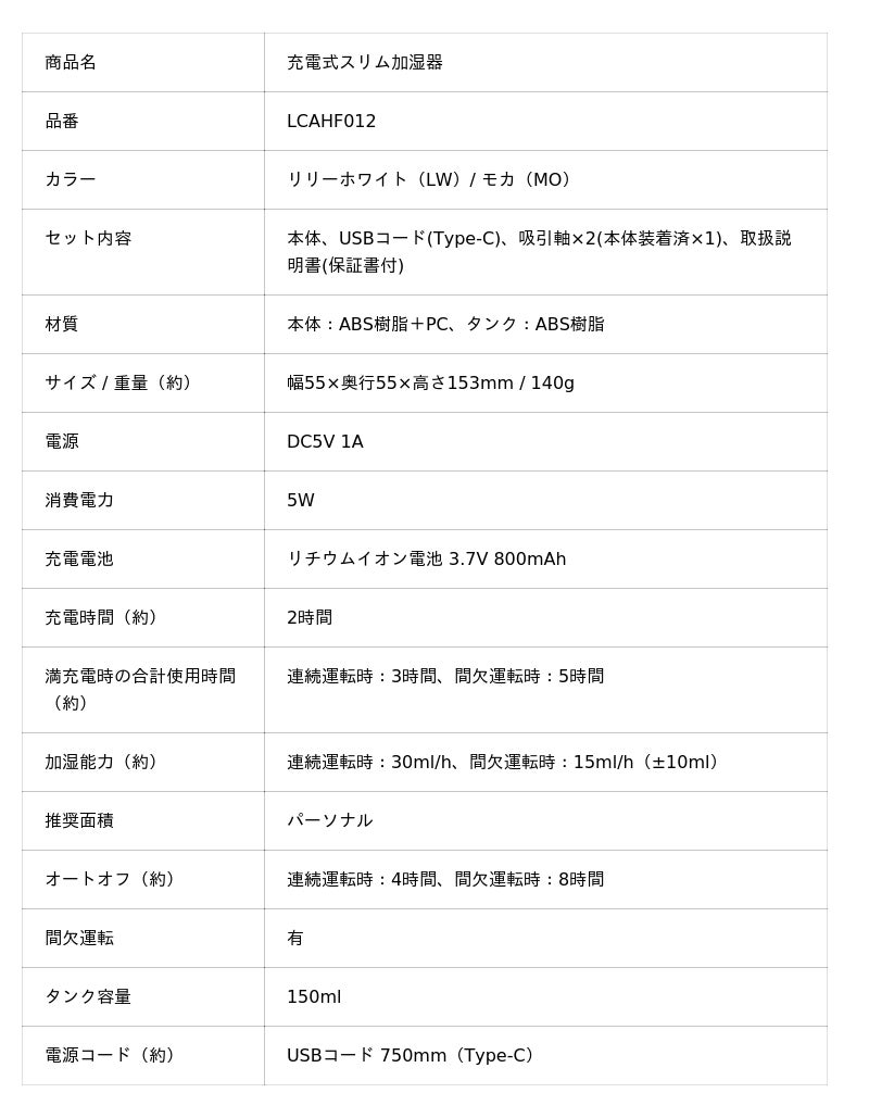 「充電式スリム加湿器」LCAHF012