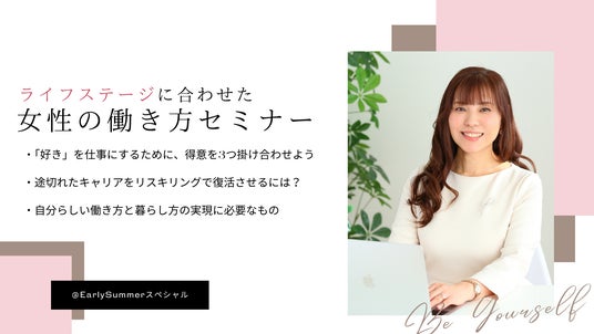 ライフステージに合わせた女性の働き方セミナー子育てやブランクを経て、「もう一度、社会とつながりたい」「好きなことを仕事にしたい」-- そんな想いに寄り添う、"好き"や"得意"の活かし方を提案します。
