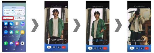 <体験概要> ホーム画面の『Gemini Live』、詳細、カメラアイコンの順にタップすると動画が流れます。Geminiに今日の天候や活動に合った服装を相談する場面をご体験いただけます。