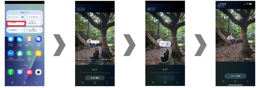 <体験概要> ホーム画面のフォトアシスト、詳細の順にタップすると画像が選択されます。削除する対象を選ぶと自動で認識されます。削除を選択後、生成をタップすると完成です。元の画像と、生成された画像の比較もお楽しみいただけます。