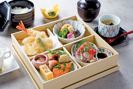 【明治記念館】"平日限定で団体のお客様向けグループランチをご案内!" 館内レストラン「羽衣」自慢の天麩羅やお造りといった旬の海や山の幸を「季節の四つ切り弁当膳」に詰め込みました
