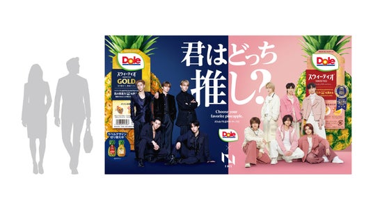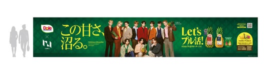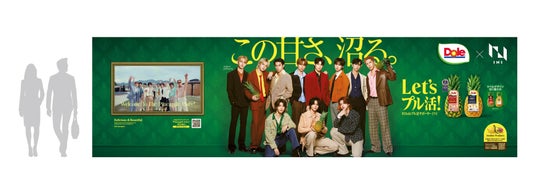 Doleは7月31日にINIの「Doleプル活サポーター」就任と、楽曲『Pineapple Juice』とのタイアップ決定を発表しました。本企画の開始を記念し、8月17日「パイナップルの日」をINIとともに盛り上げるべく、特大サイズの交通広告で皆様にINI、そして『Doleスウィーティオパイナップル』の「沼る」魅力をお届けします。