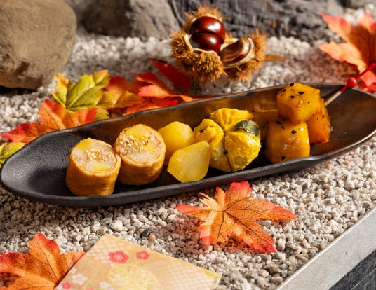 秋の味覚を代表する栗を使用した「栗稲荷」は、甘く炊いた栗ご飯を稲荷揚げで包み、口に含めば稲荷上げの上品な甘さと栗の香りが広がる和の逸品。「かぼちゃとチーズの巾着」は、かぼちゃサラダをベースにクリーミーなチーズを加えた洋風のアレンジで、まろやかな甘みとコクが魅力です。「小さな大学芋」は、外はカリッと中はしっとりのサツマイモに艶やかな糖蜜を絡めた、懐かしさと優しさを感じる一品です。