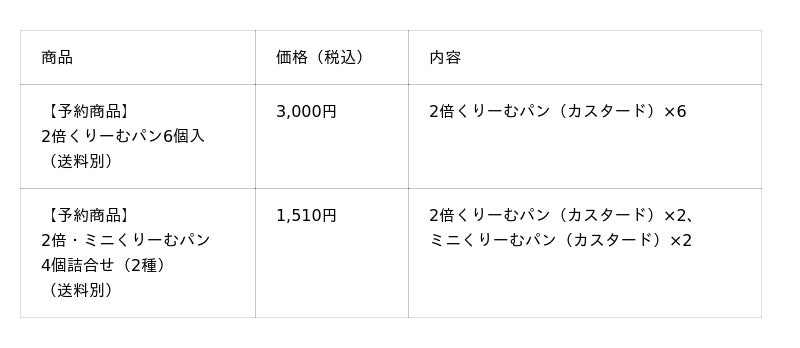 「2倍くりーむパン」は、通常のくりーむパンのパン生地・クリームが2倍の、見た目も重量感もインパクト大の逸品として、イベントで限定販売し好評を得たくりーむパンです。「溢れるクリームがたまらない」「ふんわりしっとり生地に思う存分かぶりつける」といった多くの嬉しいお声をいただきました。感謝祭を記念し、オンラインショップで期間限定の販売を行うことが決まりました。
