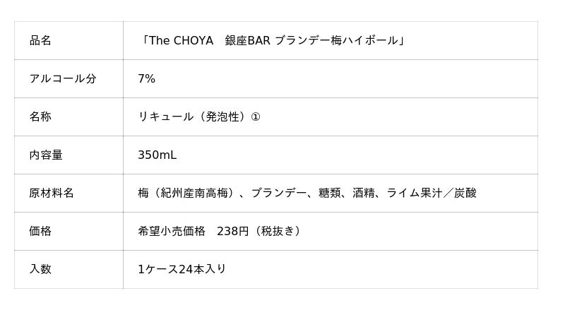 チョーヤ梅酒株式会社(本社:大阪府羽曳野市、社長:金銅重弘、以下チョーヤ)は、梅酒カクテル専門店「The CHOYA 銀座BAR」(東京都中央区)のカクテルレシピの技術から発想を得て開発した「The CHOYA 銀座BAR ブランデー梅ハイボール」を2025年8月12日(火)から全国のセブン‐イレブンの一部酒類取扱い店舗にて数量限定で発売いたします。