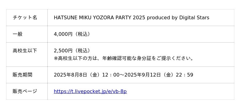 ・9月15日(月・祝)参加者には「HATSUNE MIKU YOZORA PARTY 2025 produced by Digital Stars」チケットが含まれます