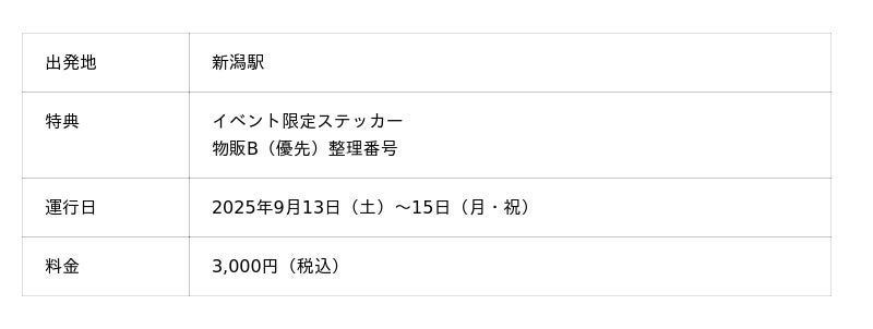 新潟駅~サントピアワールド間を直行運行する日帰り往復バスに、イベント限定のオリジナルコラボステッカーと物販B(優先)整理番号が付属した特別プランです。