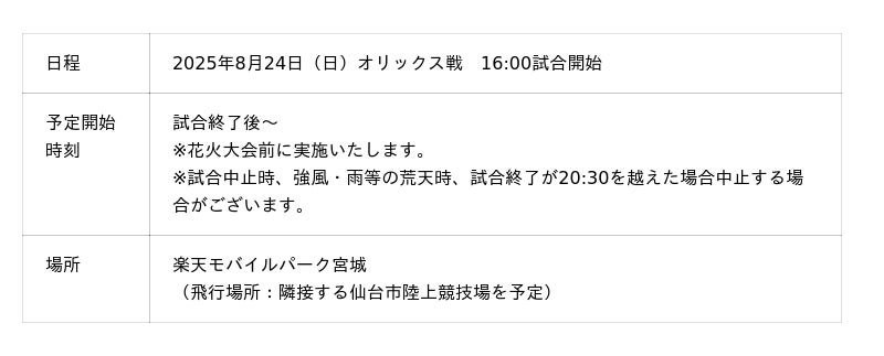株式会社協和産業(本社:大阪市浪速区:代表取締役 林 万起子)は、2025年8月24日(日)に楽天モバイルパーク宮城(宮城県仙台市)にて開催される楽天イーグルス対オリックスの終了後に「楽天イーグルス VIVIDドローンショー」を開催いたします!