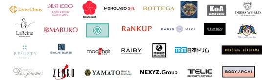 医療法人社団高整会リエートクリニック/株式会社愛粧堂/クロスサポート株式会社/モノラボギフト(株式会社エクサーズ)/BOTTEGA s.p.a/株式会社プロラボホールディングス/KoA/ドレスワールド/ラレンヌ/マルコ株式会社/株式会社GV/株式会社ランクアップ/株式会社アデランス/株式会社パリミキ/株式会社SEDY&Co/渋谷crossFM/株式会社リサスティー/Tesla Japan合同会社/株式会社バルニバービ/モッズヘア(株式会社エム・エイチ・グループ)/株式会社RAIBY/社章製作ルイヤンスタイル/株式会社日本トリム/Maison MUNETAKA YOKOYAMA(株式会社マイモード)/ラジェム/ZENKO(タマリス)/YAMATO Hotel&Residence株式会社/株式会社NEXYZ.Group/TELIC/BODY ARCHI