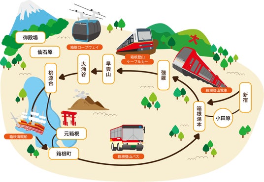 【ご参考】箱根ゴールデンコースとは「箱根ゴールデンコース」とは、1960年の箱根ロープウェイ全線開業により完成した箱根湯本駅から強羅、大涌谷を経由し、芦ノ湖を目指すコースです。箱根登山電車、箱根登山ケーブルカー、箱根ロープウェイ、箱根海賊船、箱根登山バスを利用しながら箱根を反時計回りに観光していくルートで、人気のスポットをスムーズに満喫することができます。2025年9月に開通65周年を迎えます。